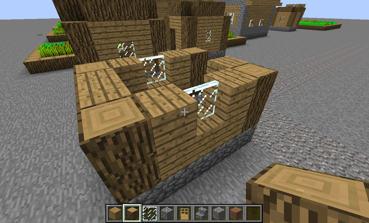 Third Row: wood on the corners and wood planks by each side of the wood not counting the door place, then put the glass panes in those spots.
