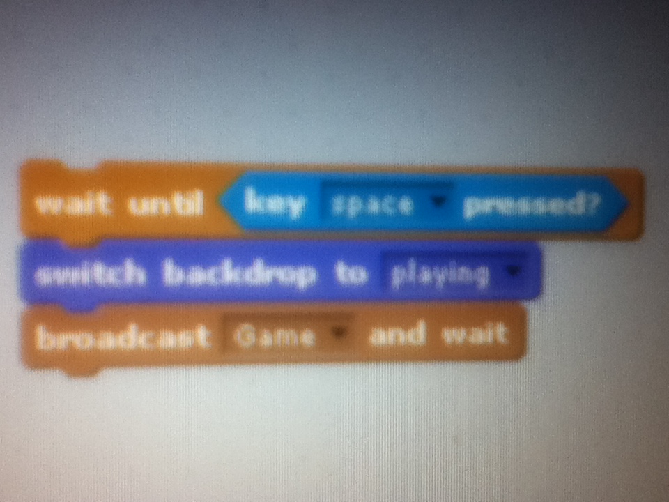 8.Add a “wait until” block and set the Boolean with “key space pressed”. Add a costume block and switch it to Playing. Put a “broadcast and wait” block and set it to broadcast ‘game’. Add these after the variables.