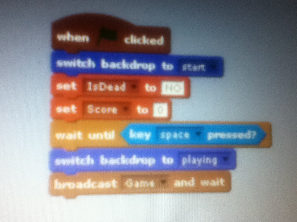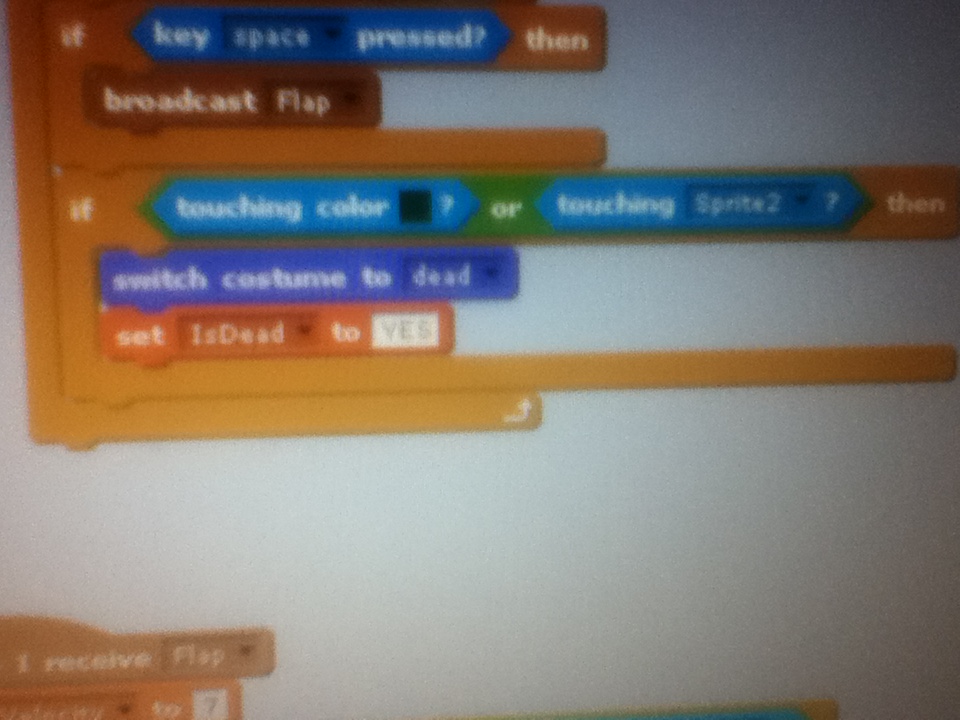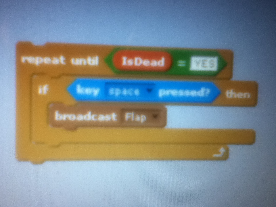 16. Go back in sprite 1 or the flappy sprite and add this after the “key space pressed” “broadcast flap” or look at the picture below.