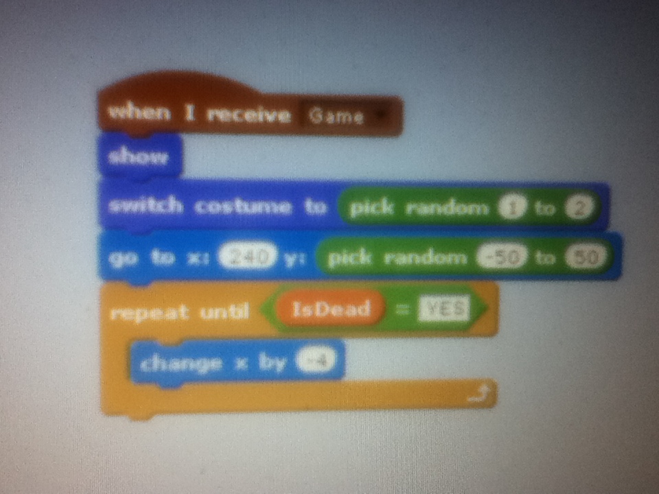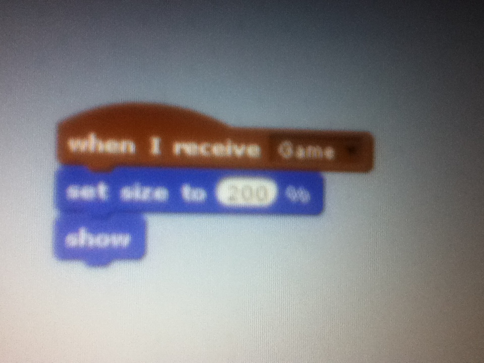 10. Now go into the flappy sprite or ‘sprite 1’ and add these blocks: “when i receive game”, “set size to (200)%” and “show”.