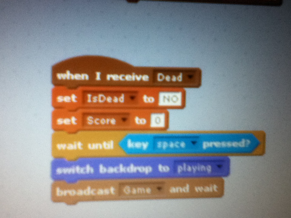 7. Make three variables: IsDead, Score & Velocity. Set IsDead to NO and Score to 0. We don’t have to worry about velocity yet. Add these two blocks after the costume block.